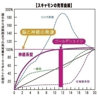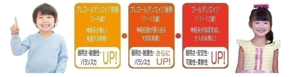 図は子供の発育を表した「スキャモンの発育曲線グラフ」です。子どもの神経系統の発達は生まれてから5歳頃までに80%、12歳でほぼ100%になります。ゴールデンエイジとは11~12歳に訪れる「神経系の発達が完成に近づき成人の水準までに達する時期」の事です。この時期に「見ただけですぐにできる」ほどの発達を促すためには、それまでの時期(プレゴールデンエイジ)に全身運動による多種多様な動きを心がける事が非常に大切です。計画的に運動を行うことで、将来的に体育・知育ともに大きな効果を期待できます。