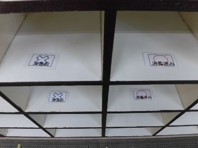 ロッカーを使用する際にロッカー内にプラカードを置いています。表が消毒済、裏が消毒前と記載されています。利用できるロッカーはカードが消毒済みとなっておりますので、そちらをご利用ください。お帰りの際、カードを裏にして頂けるようご協力をお願いします。スタッフが使用済みロッカーの消毒を随時行っていきます。