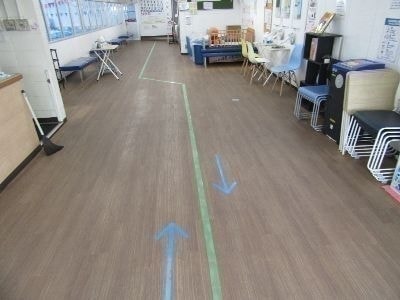 小さなお子さまにはイラストを張りましたので、間隔を開けて座っていただけるようにお願いいたします。